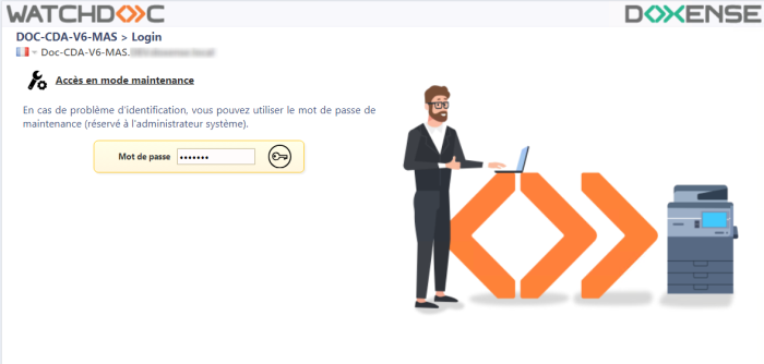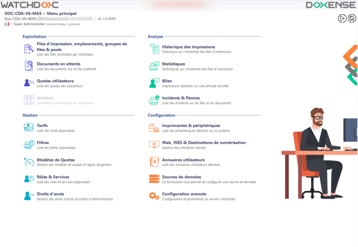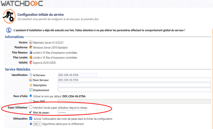 - Dans l'interface Configuration initiale, section Service Watchdoc > Super Utilisateur, changez le mot de passe administration par défaut (non nécessaire, mais fortement recommandé).
