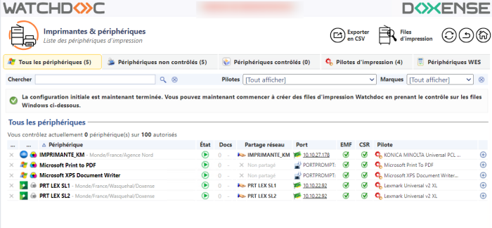 è Une fois la configuration initiale du service terminée, Watchdoc affiche les files d'impression de votre serveur dans l'interface Imprimantes & périphériques :