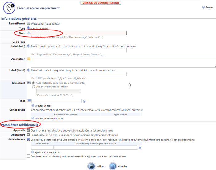 Saisissez a minima le Nom de l'emplacement.