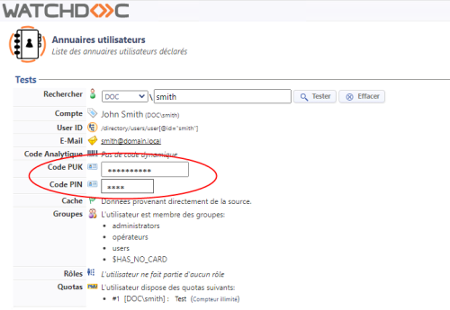Depuis la version 6.1.4926, les codes d'identification (PUK, PIN, etc.) sont inclus dans les données couvertes par le rôle d'administration "Visualisation des identités des utilisateurs".