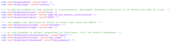 <add key="dlog/elastic/authorization" value="basic"/> = la valeur "basic" indique que l'accès au serveur est soumis à authentification par login et mot de passe : dans ce cas, il est nécessaire de compléter les deux clés suivantes. La valeur "none" indique que l'accès au serveur n'est pas soumis à authentification et les clés suivantes ne sont donc pas traitées ;