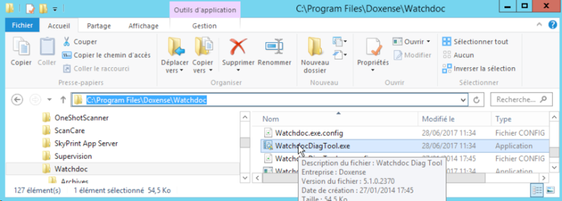 L'outil WatchdocDiagTool.exe. est fourni avec le programme d'installation de Watchdoc et donc enregistré par défaut dans le dossier