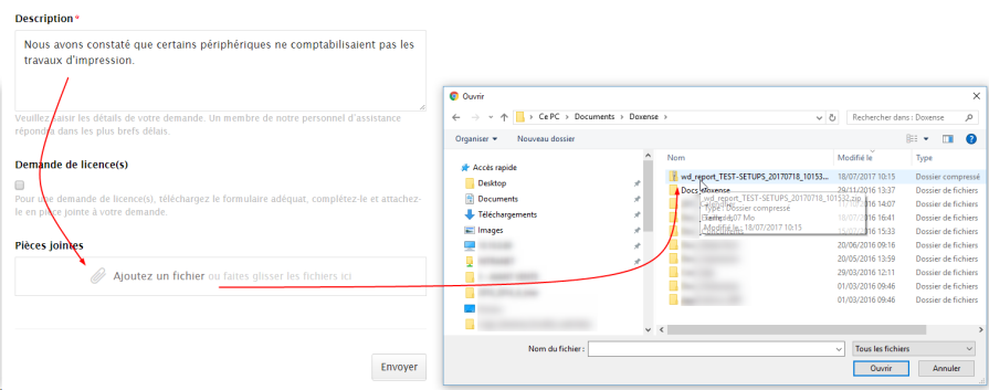 en fin de formulaire, dans la zone Pièces jointes cliquez sur le bouton Ajouter un fichier et parcourez votre espace de travail pour y sélectionner le dossier de logs généré par Watchdoc Diag Tool.