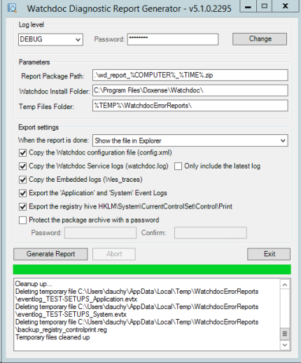 L'utilitaire crée un dossier d'archive compressé (.zip) contenant les fichiers de logs et de configuration qui permettent à l'équipe Support d'effectuer un diagnostic du dysfonctionnement constaté. Ce fichier est enregistré par défaut dans C:\Program Files\Doxense\Watchdoc et s'intitule wd_report_[NOM_DU_SERVEUR]_[AAAAMMJJ]_[HHMMSS] :