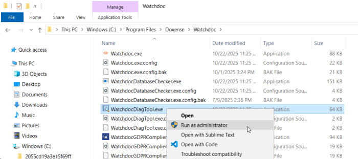 sur le serveur hébergeant Watchdoc, dans le dossier C:\Program Files\Doxense\Watchdoc\, cliquez droit sur l'application WatchdocDiagTool.exe pour l'exécuter en tant qu'administrateur ;