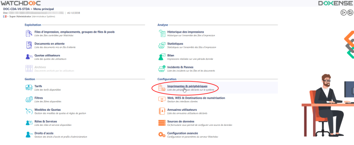 depuis le Menu Principal de Watchdoc, section Configuration, cliquez sur Imprimantes et périphériques ;