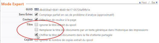 dans la section Mode Expert, cochez la case Chiffrer le titre des documents... si vous souhaitez que le titre des travaux d'impression n'apparaisse pas en clair dans la file d'attente partagée :