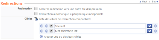 dans la section Redirections, sélectionnez, en Cibles, la ou les files d'impression vers lesquelles peuvent être envoyés les travaux d'impression :