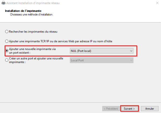 dans la boîte Installation de l'imprimante, sélectionnez Ajouter une nouvelle imprimante via un port existant, puis sélectionnez le port NUL :