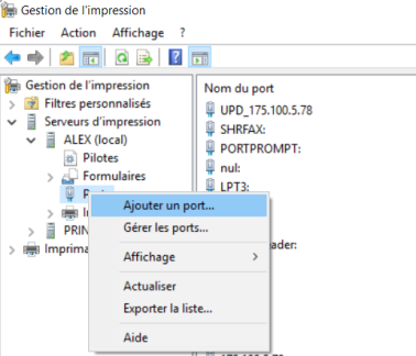 dans l'outil Gestion de l'impression ,cliquez sur serveur d'impression > Ports > Ajouter un port :