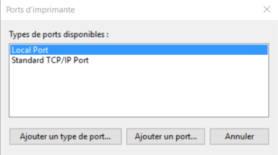 dans la fenêtre Port d'imprimante, sélectionnez le type de port Local :