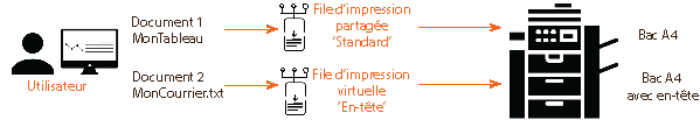 Lorsque l'utilisateur lance son impression, il choisit la file d'impression qui convient à son besoin.