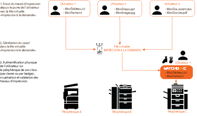 permettre l'impression "à la demande", c'est-à-dire sur n'importe quel périphérique (non prédéfini par défaut.). L'utilisateur a donc la liberté de choisir son périphérique d'impression non pas au moment où il lance l'impression de son poste de travail, mais au moment où il valide ses impressions. Les travaux sont donc stockés dans la file virtuelle en attendant d'être envoyés vers un périphérique spécifique :
