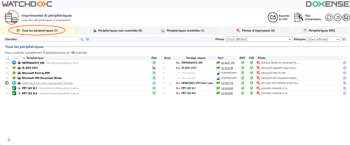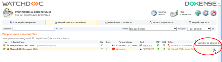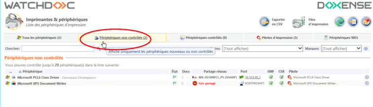 Dans cette liste sont affichés les périphériques déclarés sur le serveur mais non contrôlés par Watchdoc. Un message informe du nombre maximal de périphériques qu'il est possible de contrôler ;