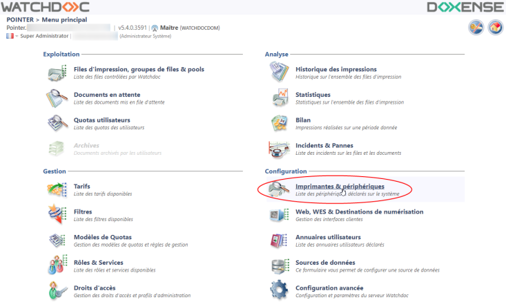depuis le Menu principal Watchdoc, section Configuration, cliquez sur Imprimantes et périphériques ;
