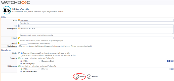 dans l'interface Création d'un rôle, configurez le rôle en lui attribuant au minimun un Nom (Ope_Site_A dans l'exemple) ;