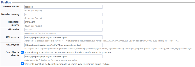 adresses : cochez la case pour limiter aux seules adresses Paybox la confirmation de paiement. Décochez la case si la confirmation de paiement sollicite un autre système et indiquez l'IP de ce système au besoin (IP d'un reverse proxy, par exemple) ;