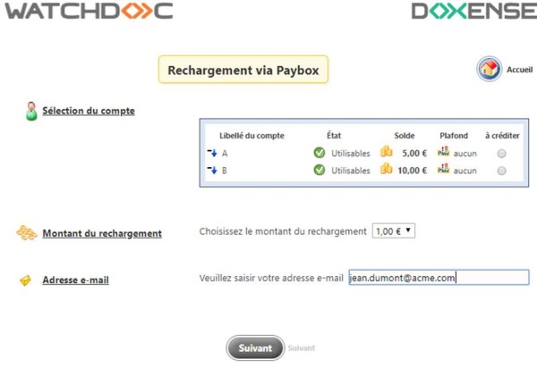 A l'aide d'un lien qui lui est fourni par l'administrateur, l'utilisateur se connecte à la page Watchdoc Rechargement via Paybox ;