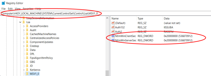 réitérez cette opération pour la clé NtlmMinServerSec.