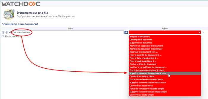 suggérer la conversion en noir et blanc : quand un utilisateur lance une impression en couleur, Watchdoc lui suggère de la convertir en noir et blanc. L'utilisateur peut alors accepter la suggestion ou la refuser pour conserver la couleur ;