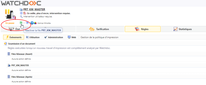 Lorsque le statut En pause s'affiche, redémarrez la file en cliquant sur le bouton Réactiver la file