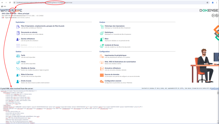 L'interface web d'administration de Watchdoc peut être affichée en mode débogage (debug) de manière à faciliter la lecture de son code. Ce mode permet d'analyser le code à des fin d'analyses et de recherche de bugs.