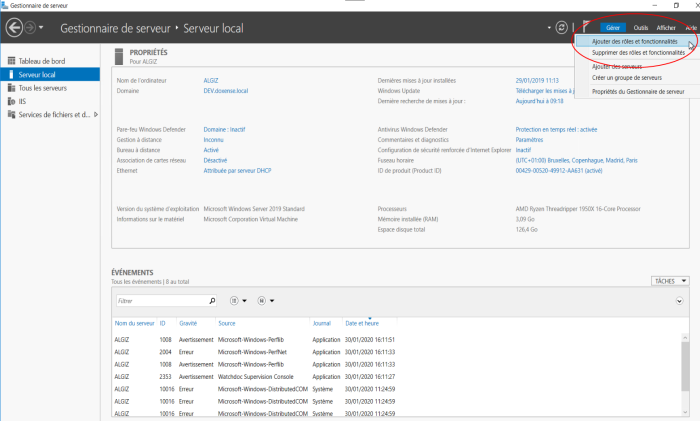 si le Service d'impression n'apparaît pas, cliquez sur l'entrée de menu Gérer, puis Ajouter des rôles et fonctionnalités ;