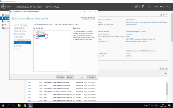 dans la liste Services de rôle, cochez la case LPD Service, puis sur le bouton Suivant ;