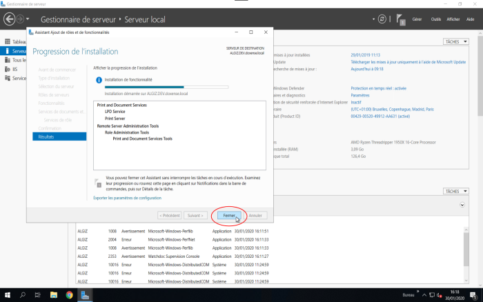 Suivez la progression de l'installation du rôle, puis cliquez sur le bouton Fermer lorsqu'elle arrive à son terme ;