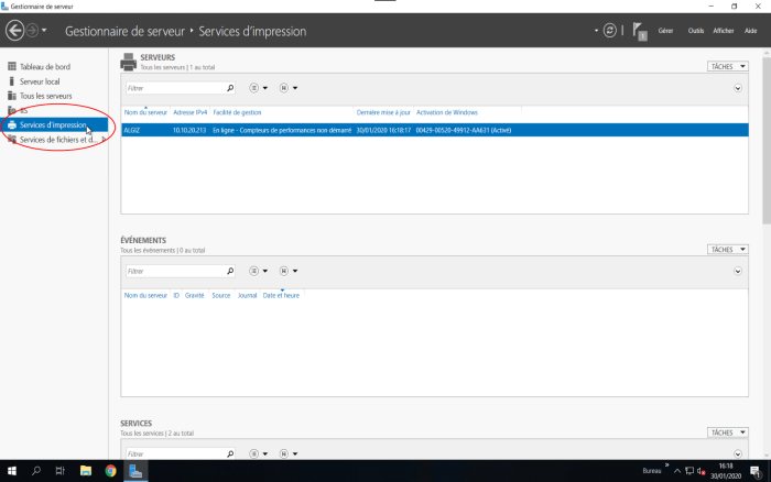 de retour dans le Gestionnaire de serveur, vérifiez dans le menu de gauche que Service d'impression est affiché :