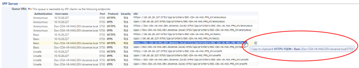 dans la section IPP Server repérez et sélectionnez l'adresse HTTPS (nous préconisons de copier l'URL correspondant au mode Basic qui nécessite une authentification par compte/mot de passe) :