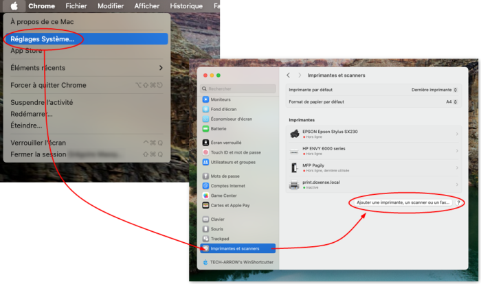 dans le menu d'administration du poste de travail, cliques sur Réglages Système > Imprimantes et scanners ;
