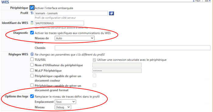 Vous pouvez vérifier dans le profil WES que les paramètres Diagnostic et Options des logs ont été cochés :