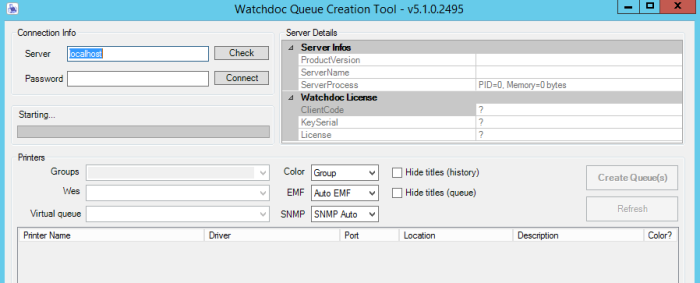 Dans l'outil Watchdoc Queue Creation Tool, complétez les paramètres de la section Connection Info: