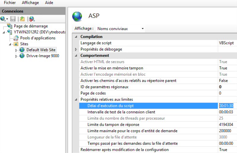 dans la liste des propriétés ASP, rendez-vous dans la section Comportement (Behavior) et déployez la section Propriétés relatives aux limites (Limits properties) ;