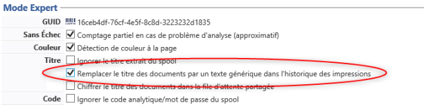 Cette impossibilité peut venir de la configuration de la file d'impression : un paramètre permet en effet à Watchdoc de remplacer le titre des documents par un texte générique dans l'historique des impressions (configuration d'une File d'impression > section Mode Expert > paramètre Titre > Remplacer le titre des documents).