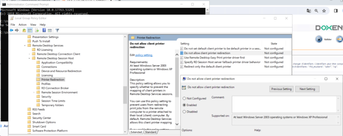 Il convient donc de désactiver la redirection MSTSC des imprimantes au niveau du serveur.