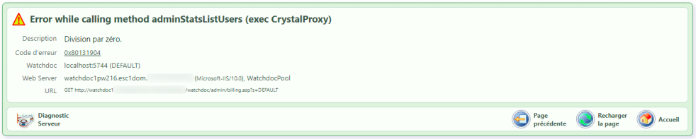 Lors de la consultation des bilans dans Watchdoc (depuis l'interface d'administration, Menu principal > section Analyse > clic sur Bilan), l'administrateur voit s'afficher le message d'erreur suivant : "Error while calling method adminStatsListUsers (exec CrystalProxy)" - Description : Division par zéro - Code d'erreur : 0x80131904