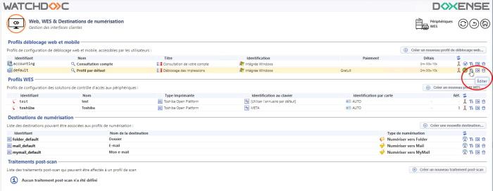 dans la liste Profils déblocage web et mobile, éditez le profil par défaut (si vous le souhaitez, vous pouvez aussi créer un nouveau profil dédié à ce mode d'authentification) ;