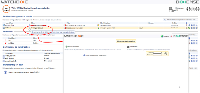 Depuis la liste des profils de déblocage, cliquez sur la loupe pour tester le profil de déblocage modifié :