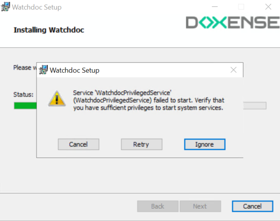 Lors de l'installation de Watchdoc 5.4.1 ou 5.5 (jusqu'à 5.5.0.4303), si on demande d'activer les Privileged services (nécessaires pour la fonction WeScan), un message d'erreur indique "Service WatchdocPrivilegedService failed to start" et l'installation échoue, quelle que soit l'option choisie pour poursuivre (Cancel, Retry ou Ignore) :