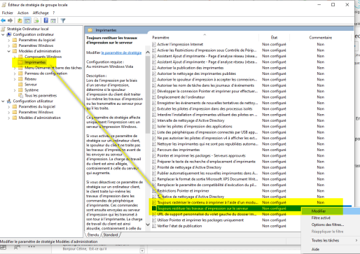 dans l'outil Computer Configuration > Administrative Templates > Printers > Always render print jobs on server