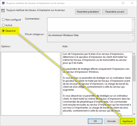 Dans l'interface du paramètre "Toujours restituer les travaux d'impression sur le serveur", cochez Désactivé, puis cliquez sur Appliquer > OK :