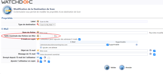 Dans l'interface Modification d'une destination de Scan, changez le paramètre Taille maximale des fichiers (en Mo) :