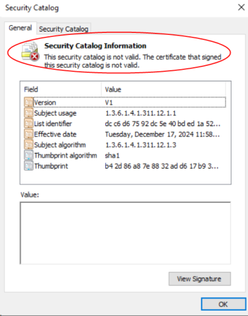 dans l'interface Security catalog, cliquez sur View signature, puis View Certificate pour connaître le nom du certificat :