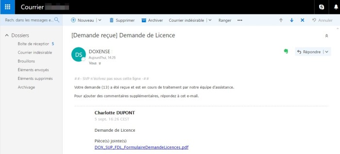 Par ailleurs, vous recevez un mail confirmant l'envoi de votre demande au Support Doxense :