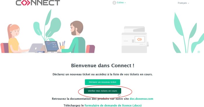 Depuis l'interface Bienvenue dans Connect, cliquez sur le bouton Vérifier mes tickets en cours :