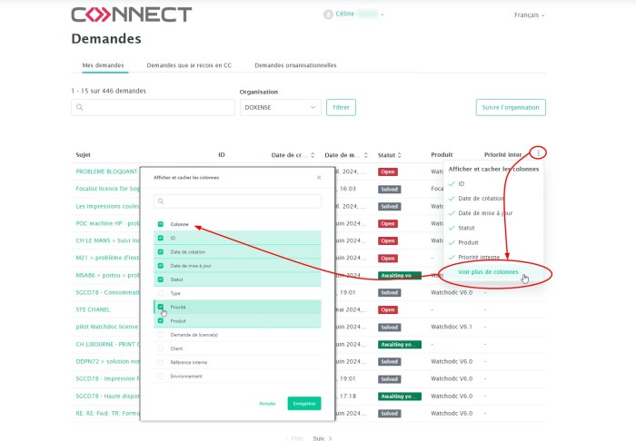 Le tableau par défaut des demandes a été conçu par le Support Doxense, mais il peut être per- sonnalisé afin d'afficher d'autres informations correspondant à vos besoins.