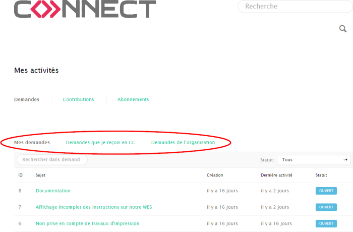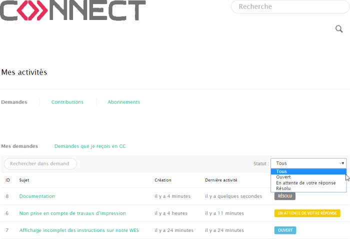 èVotre demande suivie s'inscrit dans la liste de vos activités affichée dans le portail Connect. Tant que la demande n'a pas été résolue, le statut qui lui est attribué est Ouvert ou En attente de réponse. Par ailleurs, vous recevez un mail de confirmation d'envoi de votre demande à l'équipe Support Doxense®.