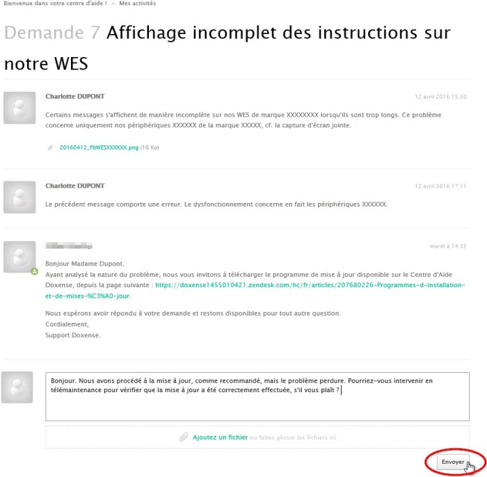 è Vous accédez à une interface dans laquelle votre demande initiale ainsi que tous leséchanges entre l'équipe Support et vous sont listés. Dans un bandeau bleu supérieur, un mes- sage vous informe que votre réponse a bien été envoyée.